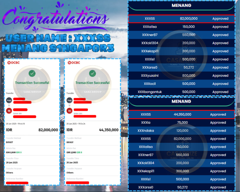 SELAMAT ATAS JACKPOT PAUS UNTUK MEMBER CASAPRIZE DENGAN USER ID : XXXSS YANG TELAH BERHASIL MENANG BESAR PADA PASARAN SINGAPORE SEBESAR Rp. 126.350.000,-