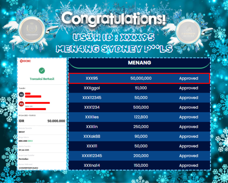 SELAMAT ATAS JACKPOT PAUS UNTUK MEMBER CASAPRIZE DENGAN USER ID : XXX95 YANG TELAH BERHASIL MENANG PADA PASARAN SYDNEY SEBESAR Rp. 50.000.000-