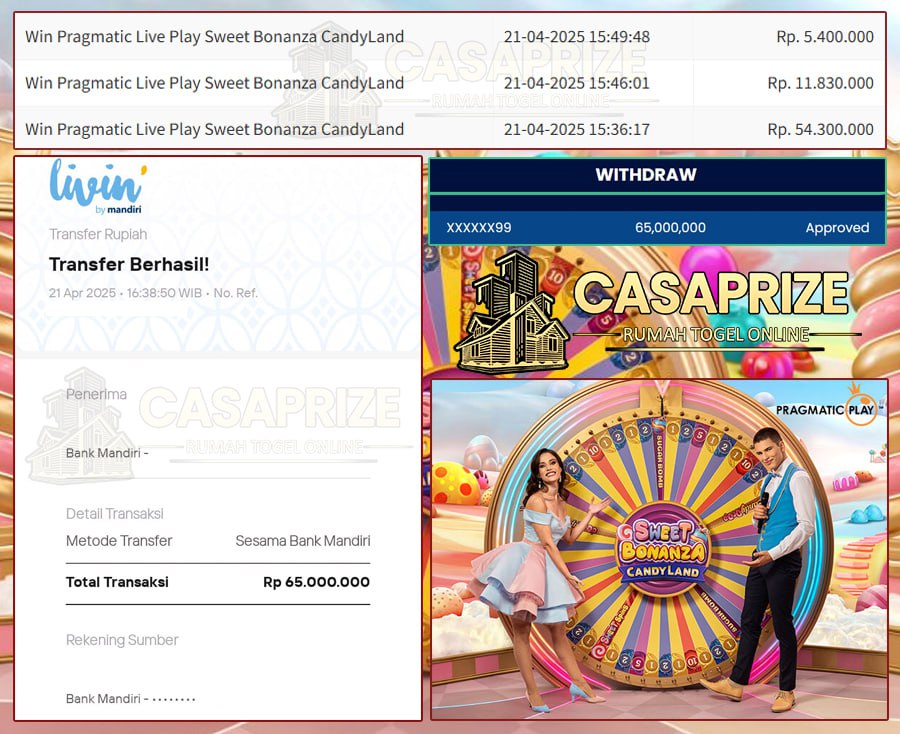Selamat kepada bosku yang bermain di CASAPRIZE dengan user id XXXXX99 yang telah mendapatkan kemenangan besar di game SWEET BONANZA CANDY LAND > PRAGMATIC CASINO
