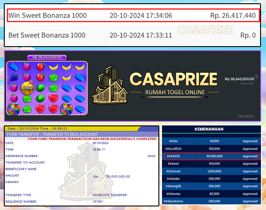 Kami ucapkan selamat untuk User ID XXXXX23 yang berhasil JACKPOT di permainan slot SWEET BONANZA 1000 di situs CASAPRIZE