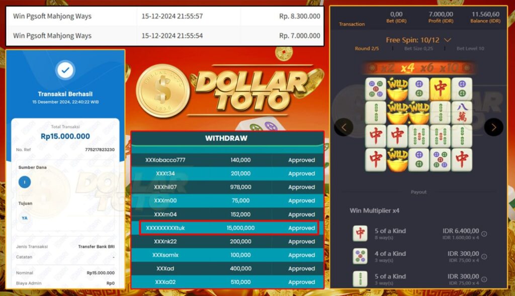 SELAMAT KEPADA MEMBER DOLLARTOTO, USER ID : XXXXXXXXXXtuk, MENANG DI GAME PG SOFT > MAHJONG WAYS.