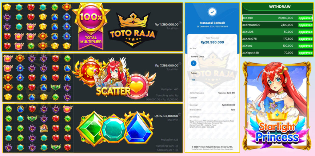 Selamat kepada bosku yang bermain di TOTORAJA dengan user id XXXX99 yang telah mendapatkan kemenangan besar di game STAR LIGHT PRINCESS > PRAGMATIC PLAY