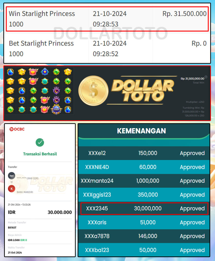 Kami ucapkan selamat untuk User ID XXX2345 yang berhasil JACKPOT di permainan slot STARLIGHT PRINCESS di situs DOLLARTOTO