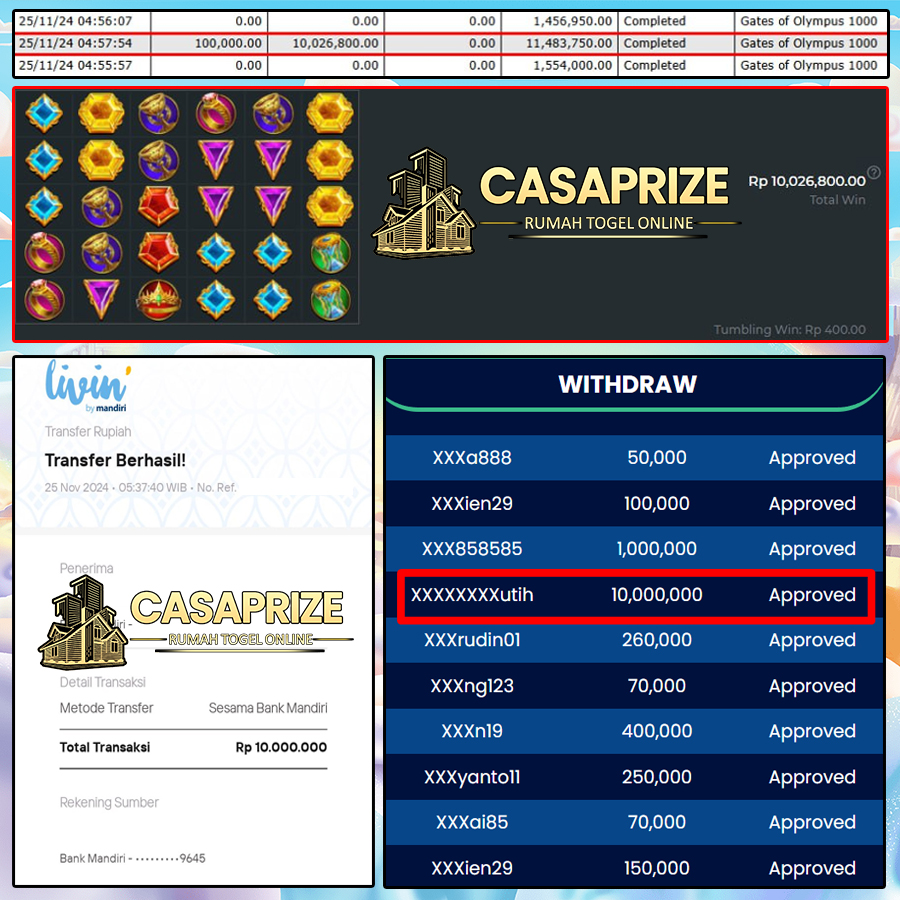 Selamat kepada bosku yang bermain di CASAPRIZE dengan user id XXXXXXXXutih yang telah mendapatkan kemenangan besar di game GATES OF OLYMPUS 1000 > PRAGMATIC SLOT