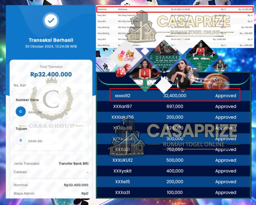 Selamat kepada bosku yang mendaftar di situs CASAPRIZE user id XXXXX92 yang telah mendapatkan kemenangan besar di SEXY BACCARAT .