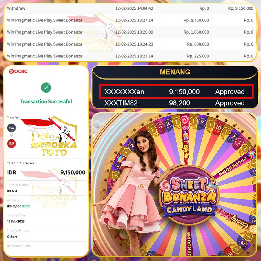 Selamat kepada bosku user id XXXXXXXan yang terdaftar di MERDEKATOTO. Dan telah mendapatkan kemenangan yang sangat besar senilai Rp. 9.150.000 DI SWEET BONANZA CANDY LAND >> LICE CASINO