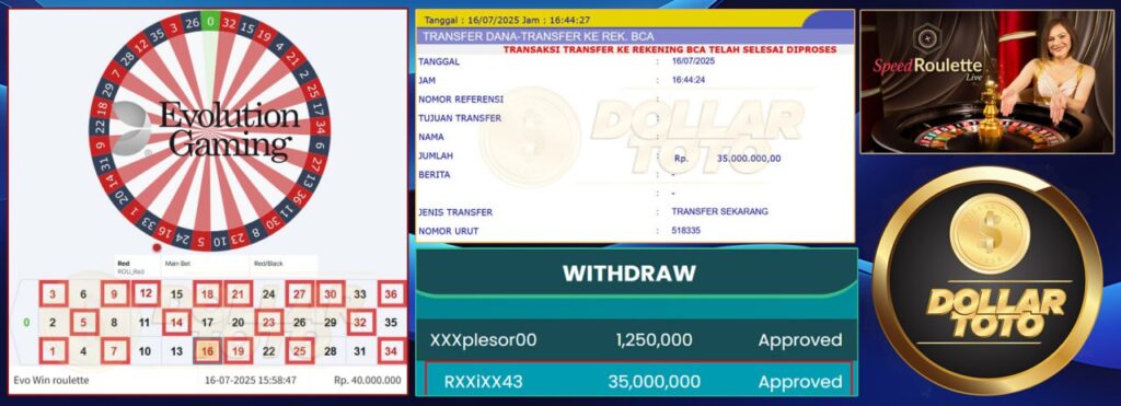 Selamat kepada member DOLLARTOTO dengan user ID RXXiXX43 yang jacpot dengan kemenangan besar dari EVOLUTION GAMING CASINO – SPEED ROULETTE. Total kemenangan sebesar Rp. 35.000.000 telah kami bayar lunas tanpa potongan sedikit pun. Saatnya bosku buktikan sendiri kemenangan sesungguhnya ada di DOLLARTOTO!