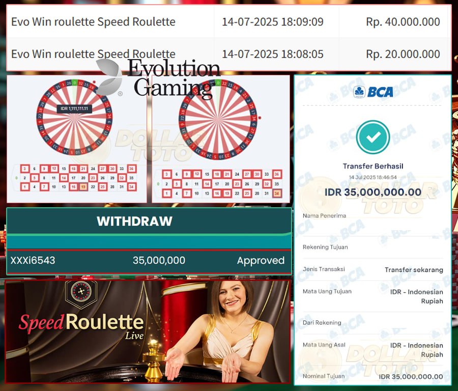 Selamat kepada member DOLLARTOTO dengan user ID XXXi6543 yang sukses membawa pulang kemenangan besar dari EVOLUTION GAMING CASINO – SPEED ROULETTE.