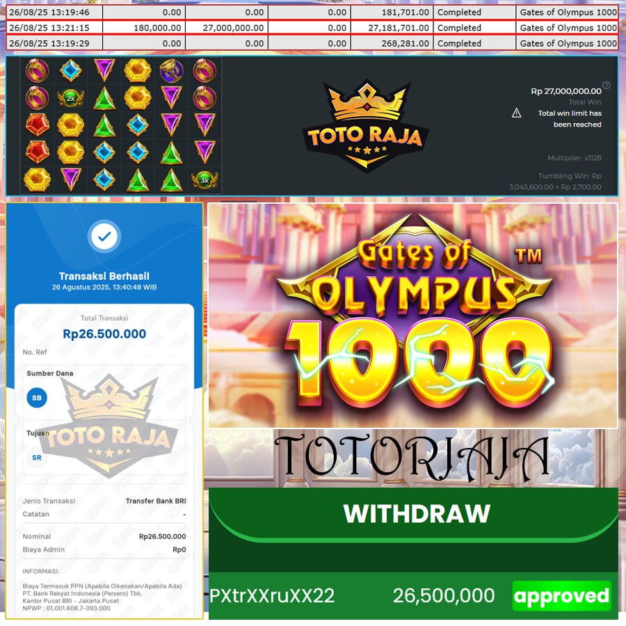 Selamat Kepada Member TOTORAJA dengan User ID PXtrXXruXX22 Atas Kemenangan di Game GATES OF OLYMPUS 1000 – PRAGMATIC PLAY SLOT.