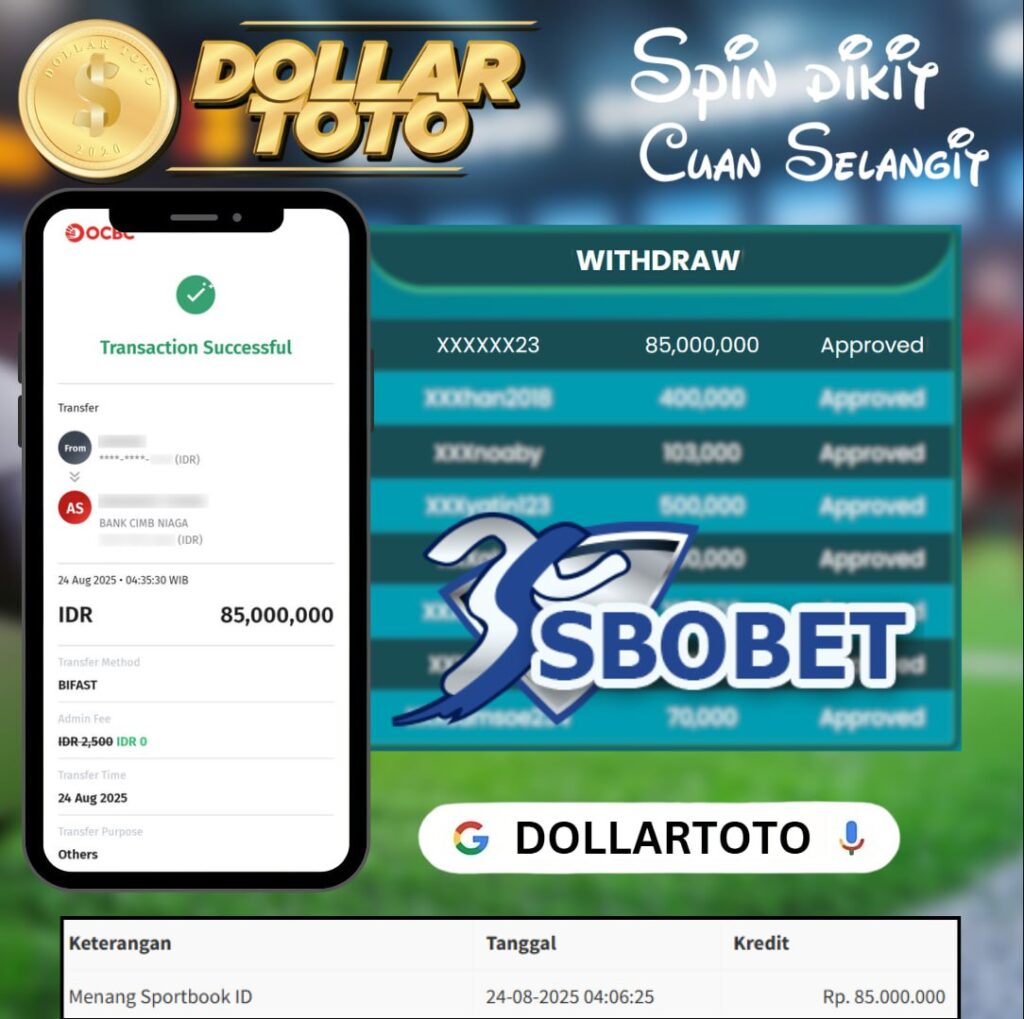 Kami ucapkan selamat kepada member DOLLARTOTO yang sudah berhasil menang di permainan Sportbook ID XXXrembo123 dengan total kemenangan mencapai Rp. 85.000.000