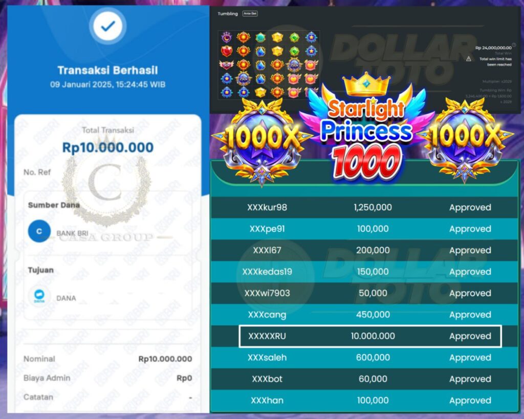 SELAMAT KEPADA MEMBER DOLLARTOTO, USER ID : XXXXXRU, MENANG DI GAME PRAGMATIC PLAY > STARLIGHT PRINCESS 1000