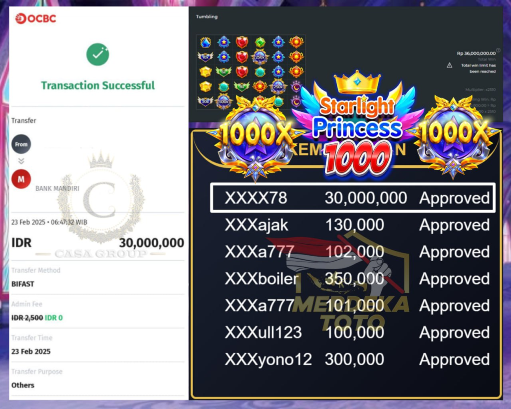 Selamat Kepada Member MERDEKATOTO dengan User ID XXXX78 Atas Kemenangan di Game STARLIGHT PRINCESS 1000.
