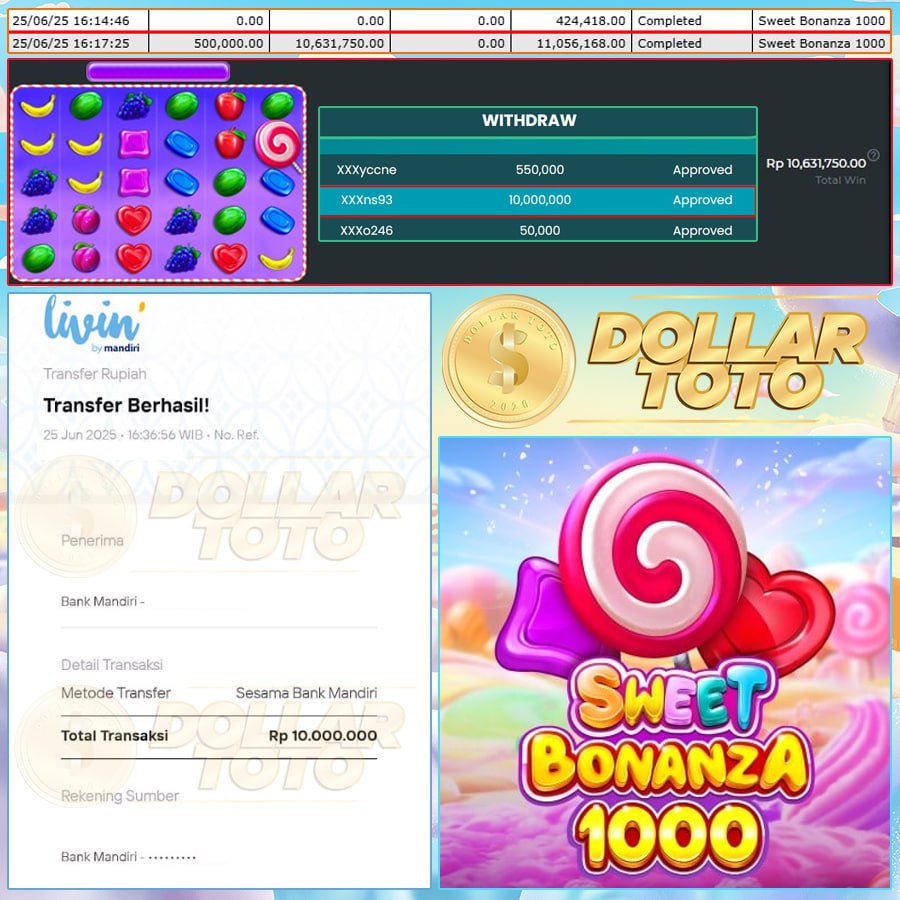 Selamat kepada bosku yang bermain di DOLLARTOTO dengan user id XXXns93 yang telah mendapatkan kemenangan besar di game SWEET BONANZA 1000!! > PRAGMATIC SLOT