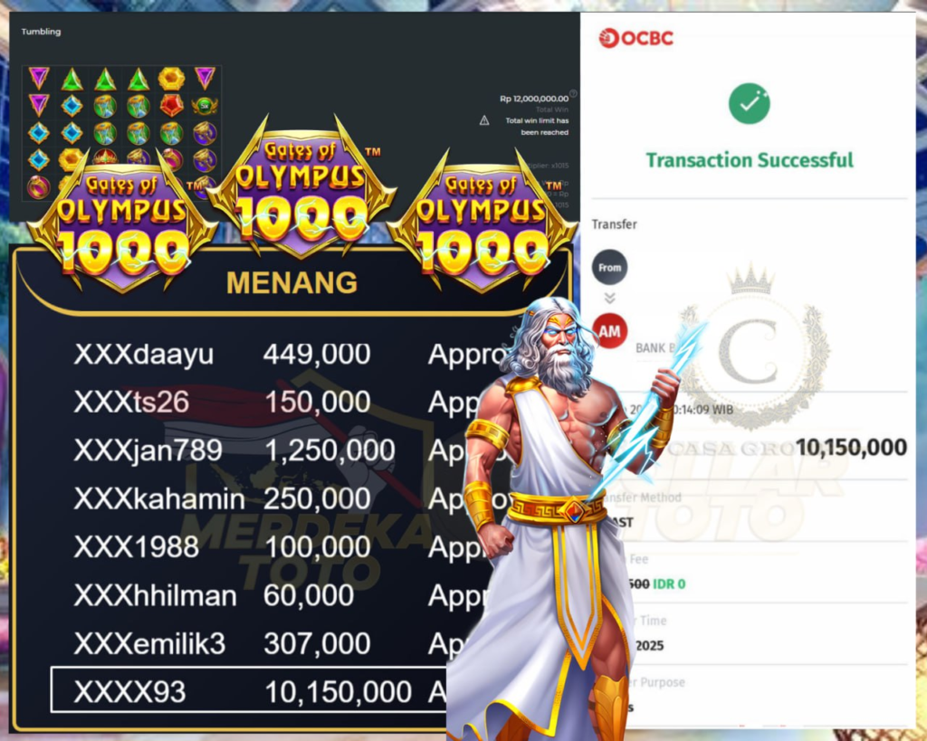 Selamat kepada bosku yang bermain di MERDEKATOTO dengan user id XXXX93 yang telah mendapatkan kemenangan besar di game GATES OF OLYMPUS 1000 > PRAGMATIC SLOT.