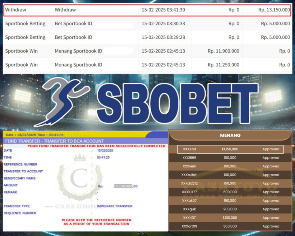 Selamat Kepada Member Casatoto dengan User ID XXXXXO9 yang Kembali Meraih Kemenangan Dari Game SBOBET.