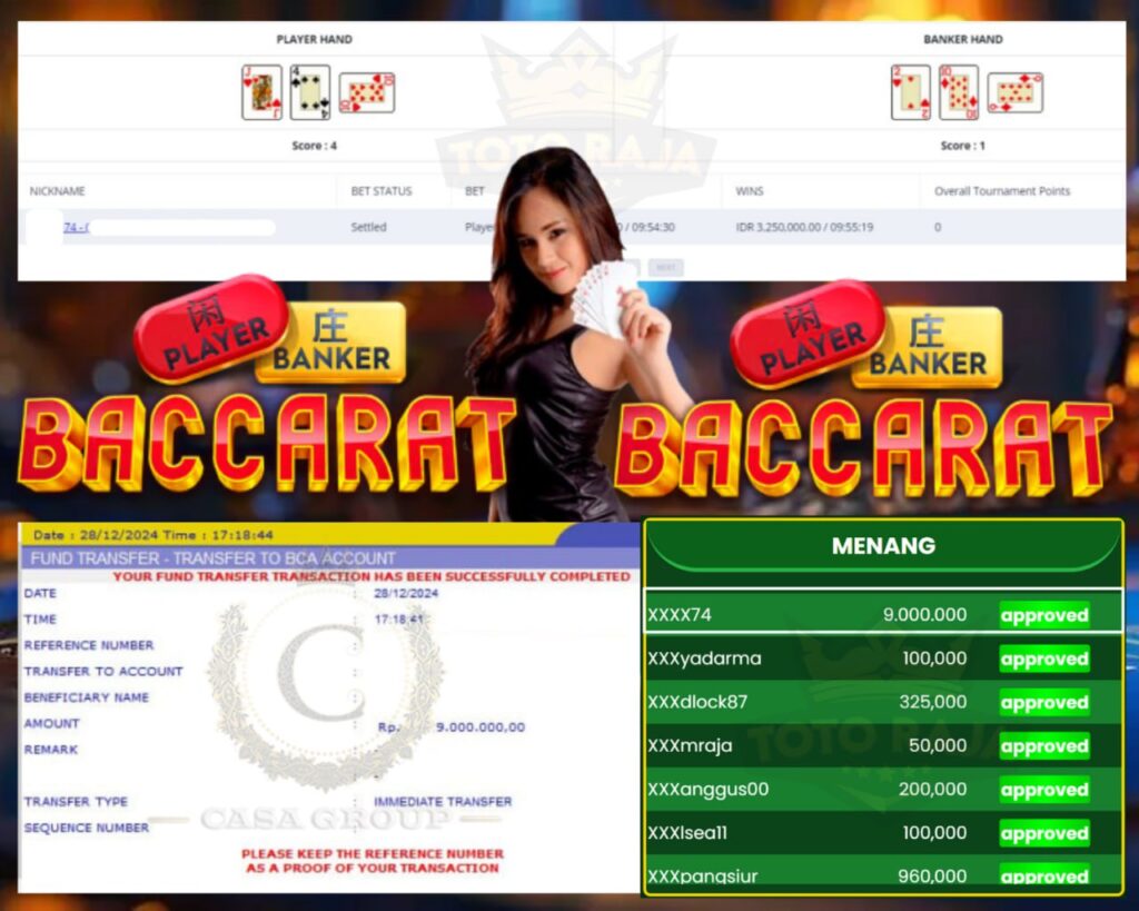 Selamat kepada bosku yang bermain di TOTORAJA dengan user id XXXX74 yang telah mendapatkan kemenangan besar di game BACARAT > PRAGMATIC LIVE CASINO