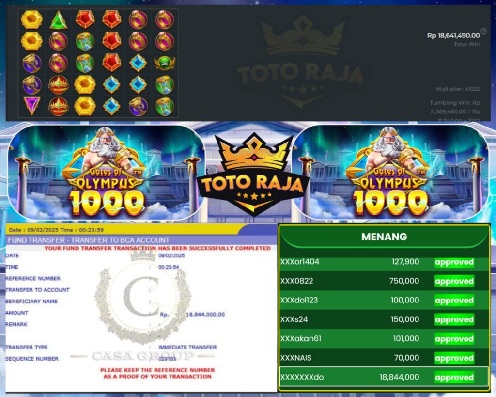 Selamat kepada bosku yang bermain di TOTORAJA dengan user id XXXXXXXDO yang telah mendapatkan kemenangan besar di game GATES OF OLYMPUS 1000⚡️ > PRAGMATIC SLOT
