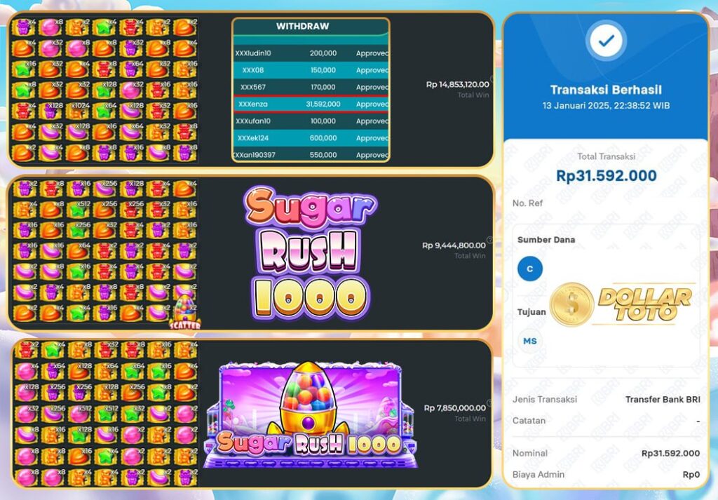 SELAMAT KEPADA MEMBER DOLLARTOTO, USER ID : XXXXnza, MENANG DI GAME PRAGMATIC PLAY > SUGAR RUSH 1000