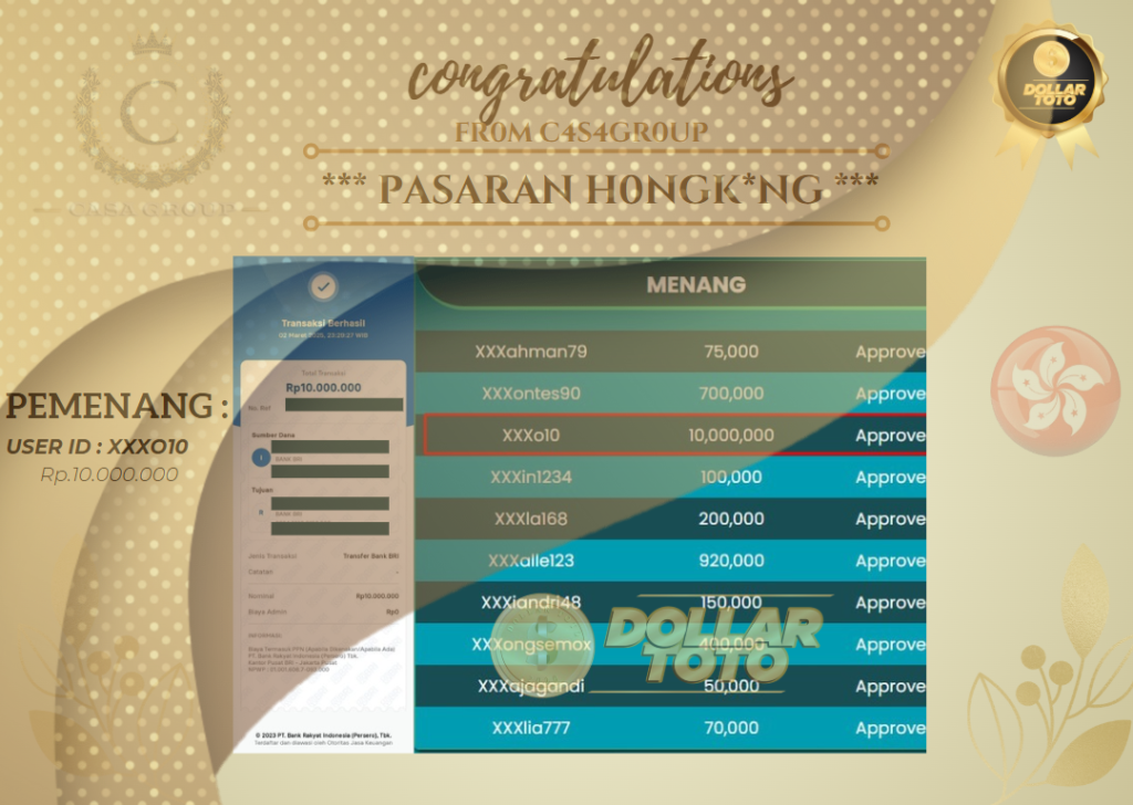 Selamat kepada User id XXXO10 yang sudah berhasil mendapatkan win besar dari hasil bet pasaran HONGKONG di situs dollartoto dengan Total pencaiaran sebesar 10 juta langsung di bayar LUNAS,bagi yang mau mendapatkan jp seperti user id ini yukk segera daftarkan akun baru nya di bawah ini >>