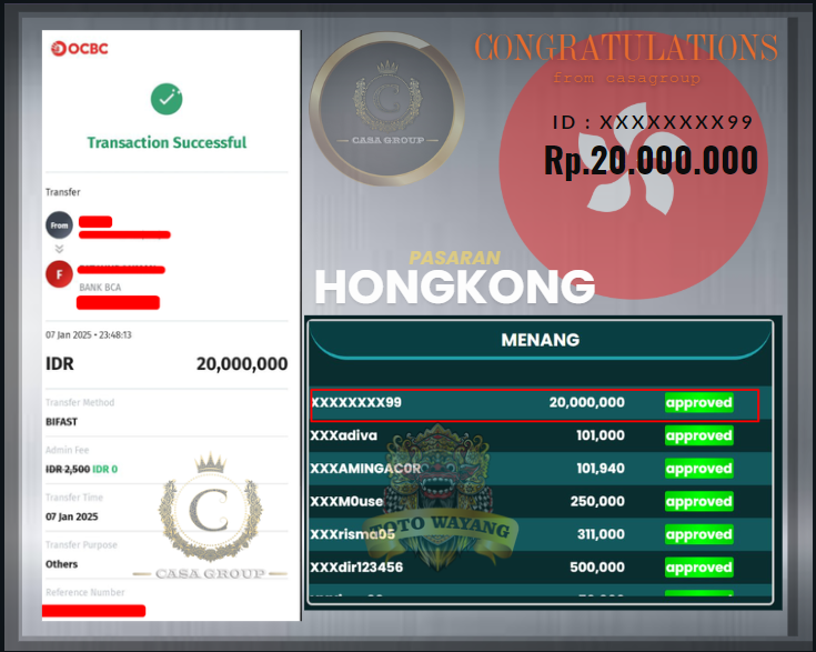 Selamatt kepada user id XXXXXXXXX99 yang sudah berhasil meraih win besar di pasaran HONGKONG .