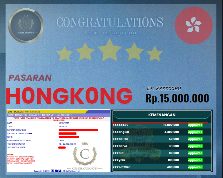 Selamat kepada user id XXXXXX90 yang sudah berhasil mendapatkan WIN besar dari pasaran HONGKONG .Untuk total pencairan sebesar 15 juta langsung di bayar LUNAS dan gak pakai lama ,Hanya di BO naungan casagroup yang paling Aman & Terpercaya .Bagi yang mau ikut Yukk segera daftarkan akun baru nya di >> CASAGROUP