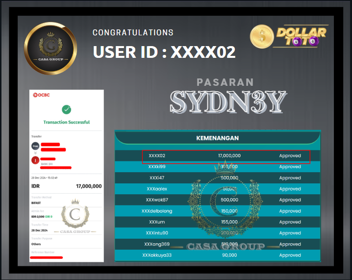 selamat kepada user id XXXX02 yang telah mendapatkan win besar dari bet pasaran SYDNEY di suasana menjelang tahun baru (semoga hoki selalu )