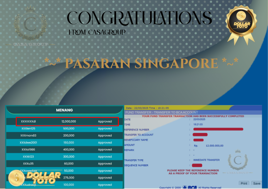 Selamat kepada User id XXXXXXDI yang sudah berhasil mendapatkan win besar dari hasil bet pasaran SINGAPORE di situs dollartoto dengan Total pencaiaran sebesar 12 juta langsung di bayar LUNAS, bagi yang mau mendapatkan jp seperti user id ini yukk segera daftarkan akun baru nya di bawah ini >>