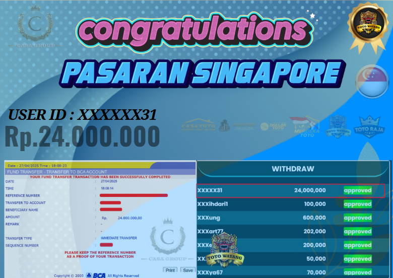 Selamat kepada User id XXXXXX31 yang sudah berhasil mendapatkan win besar dari hasil bet pasaran SINGAPORE di situs totowayang dengan Total pencaiaran sebesar 24 juta langsung di bayar LUNAS,