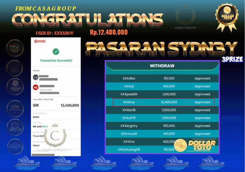 Selamat kepada User id XXXXXKO yang sudah berhasil mendapatkan win besar dari hasil bet pasaran SYDNEY di situs dollartoto dengan Total pencairan sebesar Rp.12.400.000 langsung di bayar LUNAS,