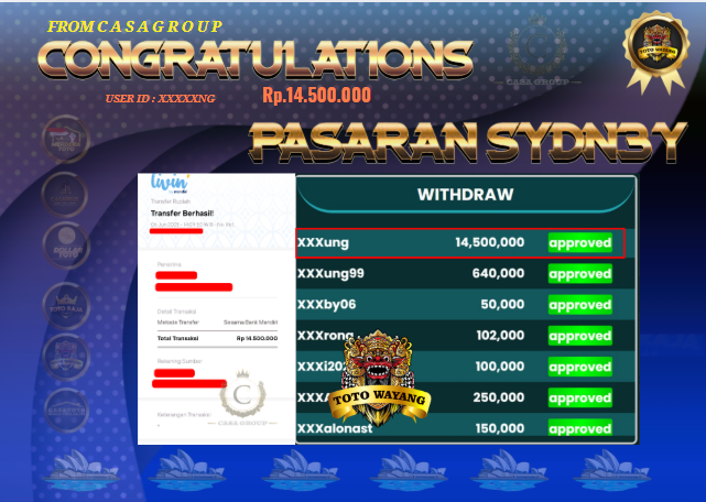 Selamat kepada User id XXXXng yang sudah berhasil mendapatkan win besar dari hasil bet pasaran SIDNEY 3 PRIZE di situs totowayang dengan Total pencairan sebesar Rp.14.500.000 langsung di bayar LUNAS,