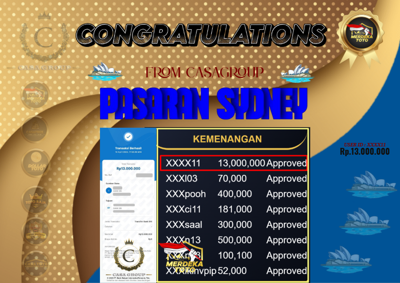 Selamat kepada User id XXXX11 yang sudah berhasil mendapatkan win besar dari hasil bet pasaran SYDNEY LOTTO di situs merdekatoto dengan Total pencaiaran sebesar 13 juta langsung di bayar LUNAS.