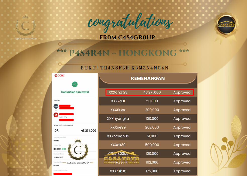 Selamat kepada User id XXXandi23 yang sudah berhasil mendapatkan win besar dari hasil bet pasaran HONGKONG di situs CASATOTO dengan Total pencaiaran sebesar Rp.43.271.000 langsung di bayar LUNAS,bagi yang mau mendapatkan jp seperti user id ini yukk segera daftarkan akun baru nya di bawah ini >>