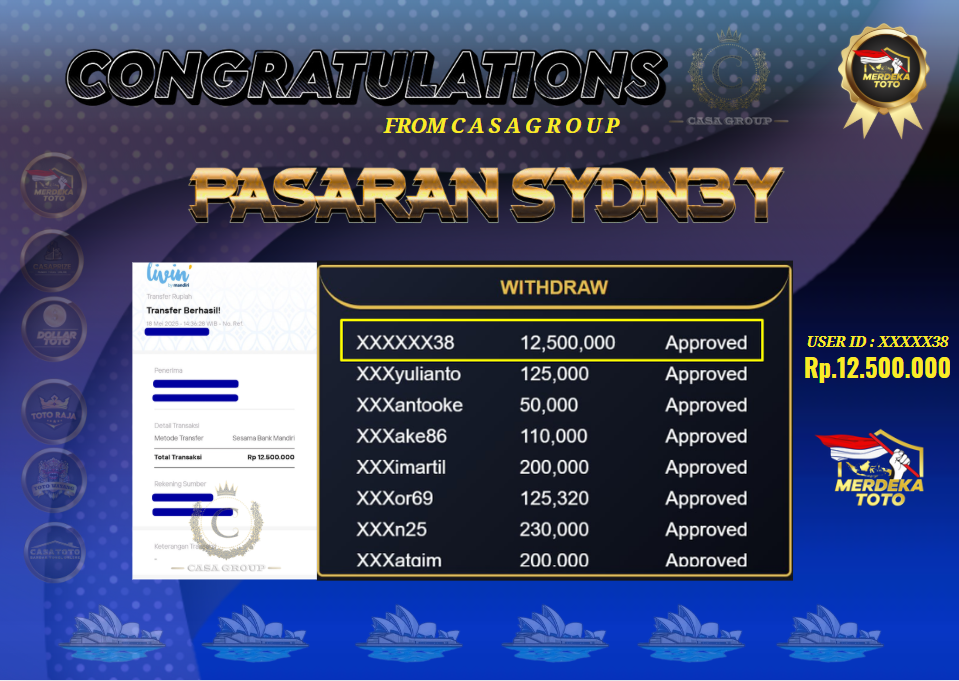 Selamat kepada User id XXXXX38 yang sudah berhasil mendapatkan win besar dari hasil bet pasaran SYDNEY di situs merdekatoto dengan Total pencaiaran sebesar Rp.12.500.000 langsung di bayar LUNAS,