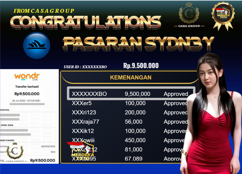 elamat kepada User id XXXXXXXXBO yang sudah berhasil mendapatkan win besar dari hasil bet pasaran SYDNEY di situs merdekatoto dengan Total pencaiaran sebesar Rp.9.500.000 langsung di bayar LUNAS,