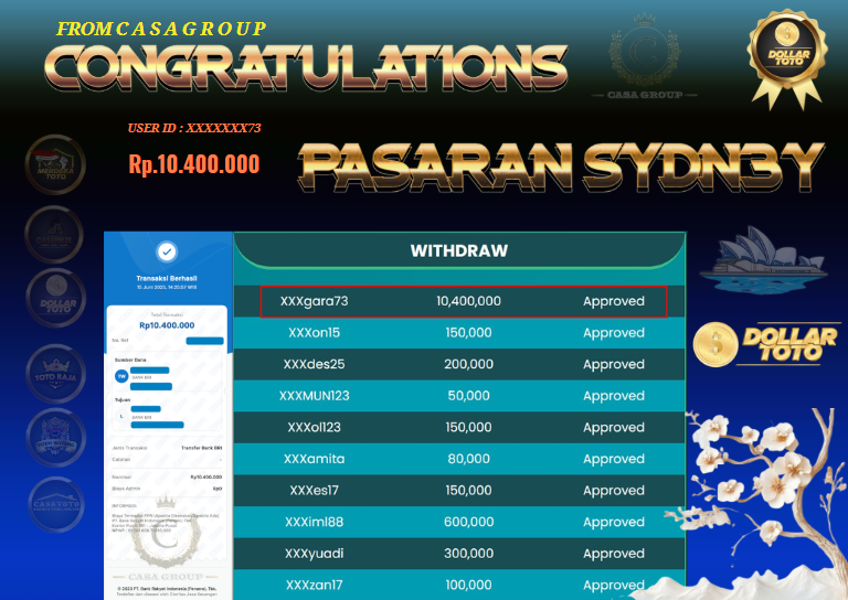 Selamat kepada User id XXXXXX73 yang sudah berhasil mendapatkan win besar dari hasil bet pasaran SYDNEY di situs dollartoto dengan Total pencairan sebesar Rp.10.400.000 langsung di bayar LUNAS,