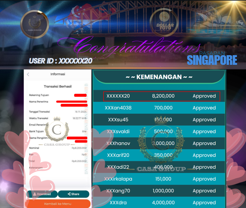 Selamat kepada User ID XXXXXX20 yang berhasil menang di pasaran SINGAPORE