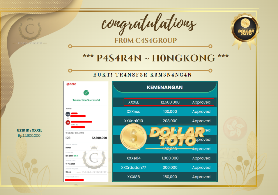 Selamat kepada User id XXXEL yang sudah berhasil mendapatkan win besar dari hasil bet pasaran HONGKONG di situs dollartoto dengan Total pencaiaran sebesar Rp.12.500.000 langsung di bayar LUNAS,bagi yang mau mendapatkan jp seperti user id ini yukk segera daftarkan akun baru nya di bawah ini >>