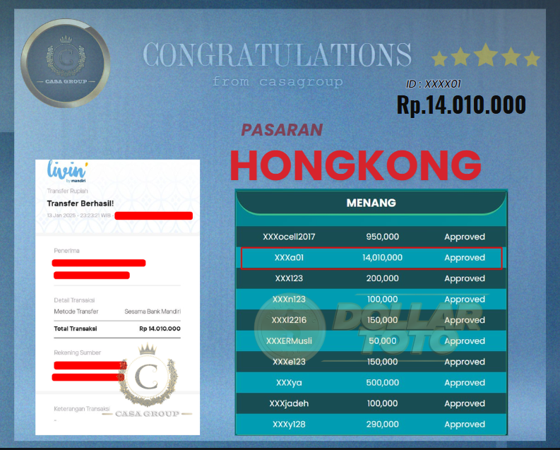 Selamat kepada user id XXXX01 yang sudah berhasil mendapatkan WIN besar dari pasaran HONGKONG . Untuk total pencairan sebesar 14 juta langsung di bayar LUNAS dan gak pakai lama , Hanya di BO naungan casagroup yang paling Aman & Terpercaya. Bagi yang mau ikut Yukk segera daftarkan akun baru nya di >> CASAGROUP