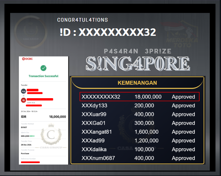 Selamat kepada user id xxxxxxxxx32 yang sudah mendapatkan win besar dari bet pasaran SINGAPORE di situs merdekatoto .