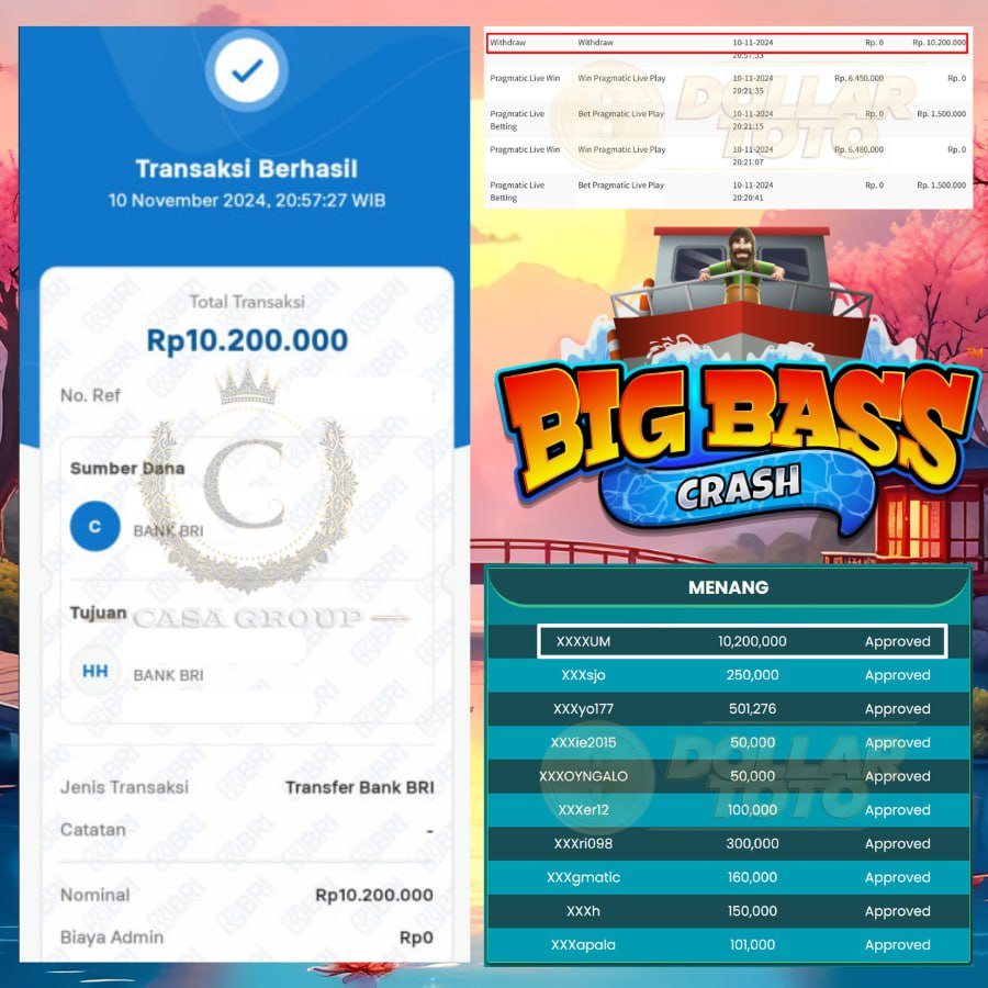 SELAMAT KEPADA MEMBER DOLLARTOTO, USER ID : XXXXUM, MENANG DI PRAGMATIC CASINO > BIG BASS CRASH.