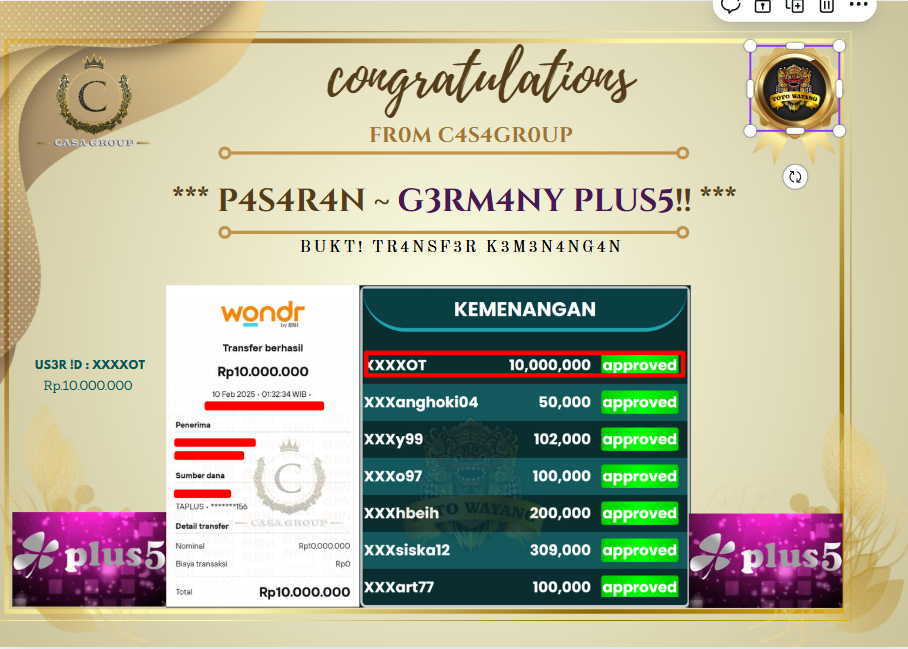 Selamat kepada user id XXXXOT yang sudah berhasil mendapatkan WIN dari pasaran GERMANY PLUS5 .Untuk total pencairan sebesar 10 juta langsung di bayar LUNAS dan gak pakai lama ,Hanya di BO naungan casagroup yang paling Aman & Terpercaya .Bagi yang mau ikut Yukk segera daftarkan akun baru nya di >> CASAGROUP