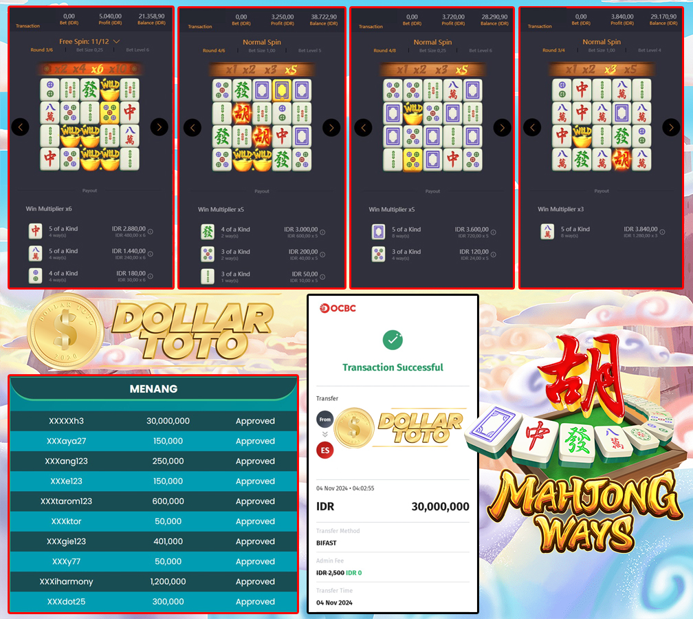 SELAMAT KEPADA MEMBER DOLLARTOTO, USER ID : XXXXXh3, MENANG DI GAME PG SOFT> MAHJONG WAYD
