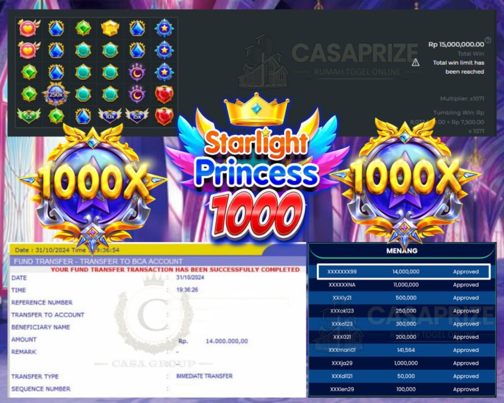 Selamat kepada bosku yang mendaftar di situs CASAPRIZE user id XXXXXXX99 yang telah mendapatkan kemenangan besar di STARLIGHT PRINCESS.