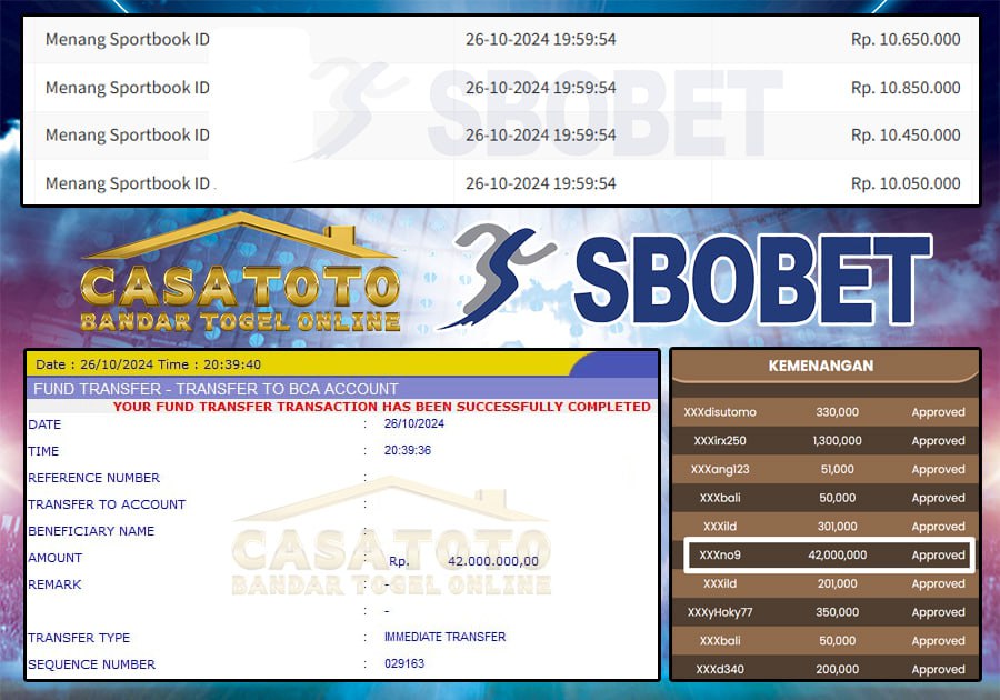Selamat kepada member CASATOTO user id XXXXO9 yang telah mendapat kemenangan di SBOBET.