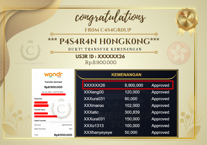 Selamat kepada User id XXXXXX26 yang berhasil win di pasaran HONGKONG di bo merdekatoto .