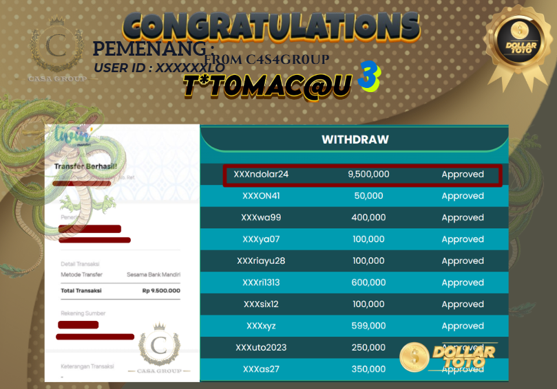 Selamat kepada user id XXXXXX24 yang sudah berhasil mendapatkan cuan dari pasaran TOTOMACAU 3 .Untuk total pencairan sebesar Rp.9.500.000 langsung di bayar LUNAS dan gak pakai lama ,