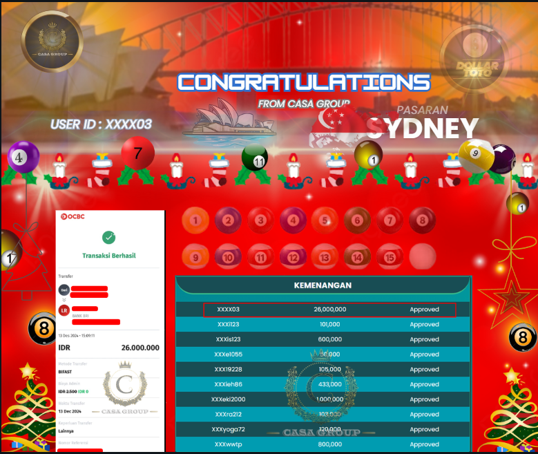 Selamat kepada user id XXXX03 yang sudah mendapatkan win besar dari pasaran SYDNEY di situs dollartoto